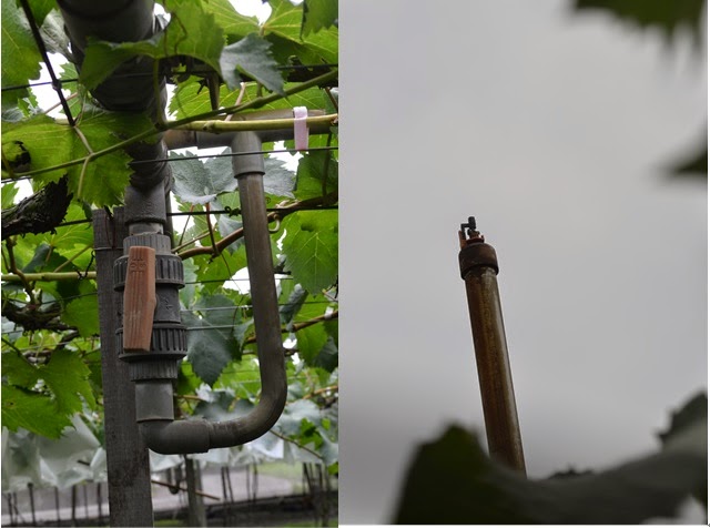 在路途中看到的葡萄園,他們的套袋只是像戴斗笠似的套住,而就賴阿姨所說,她們是在葡萄開始轉紅之後才開始套袋,而且這樣的方式是為了方便「洗農藥」!!!然而套袋原本的目的除了防病蟲害,最主要是為了留住葡萄的「香氣」,所以戴斗笠式的套袋方式就無法達到保留香氣的效果。賴阿姨也表示很多標榜「套袋葡萄」的葡萄其實都是戴斗笠式的套袋,直到出貨前才換成包裹式的套袋。賴阿姨家的葡萄從開始結出飽滿的綠色葡萄的時候便開始套袋,有別於他人,她們是包裹式的套袋,是貨真價實的套袋葡萄喔!!